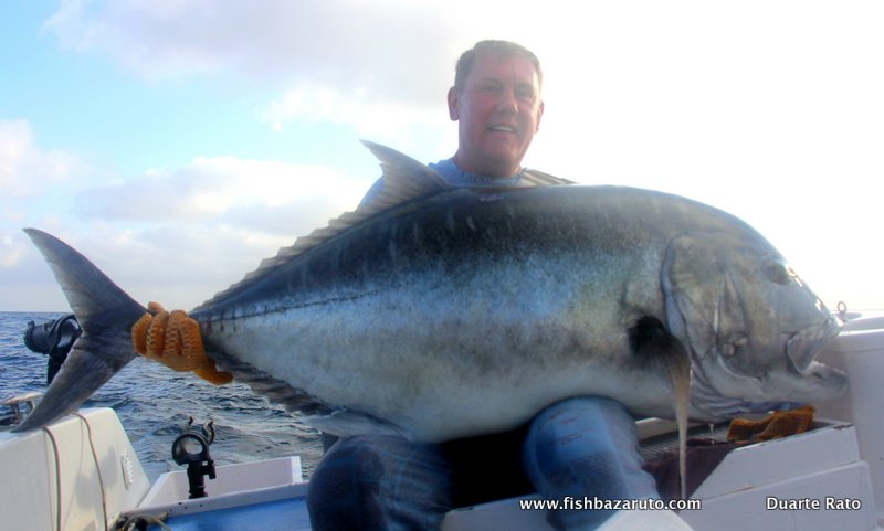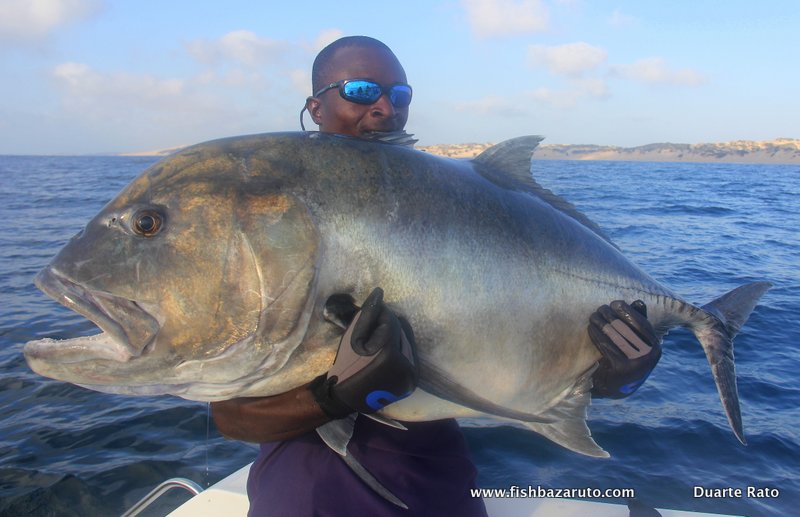 The following is an excerpt from this week’s report, which we publish first on http://fishbazaruto.com…this report features one serious GT, or giant trevally or giant kingfish or caranx ignoblis, caught and released by one of Duarte’s clients, this past week: