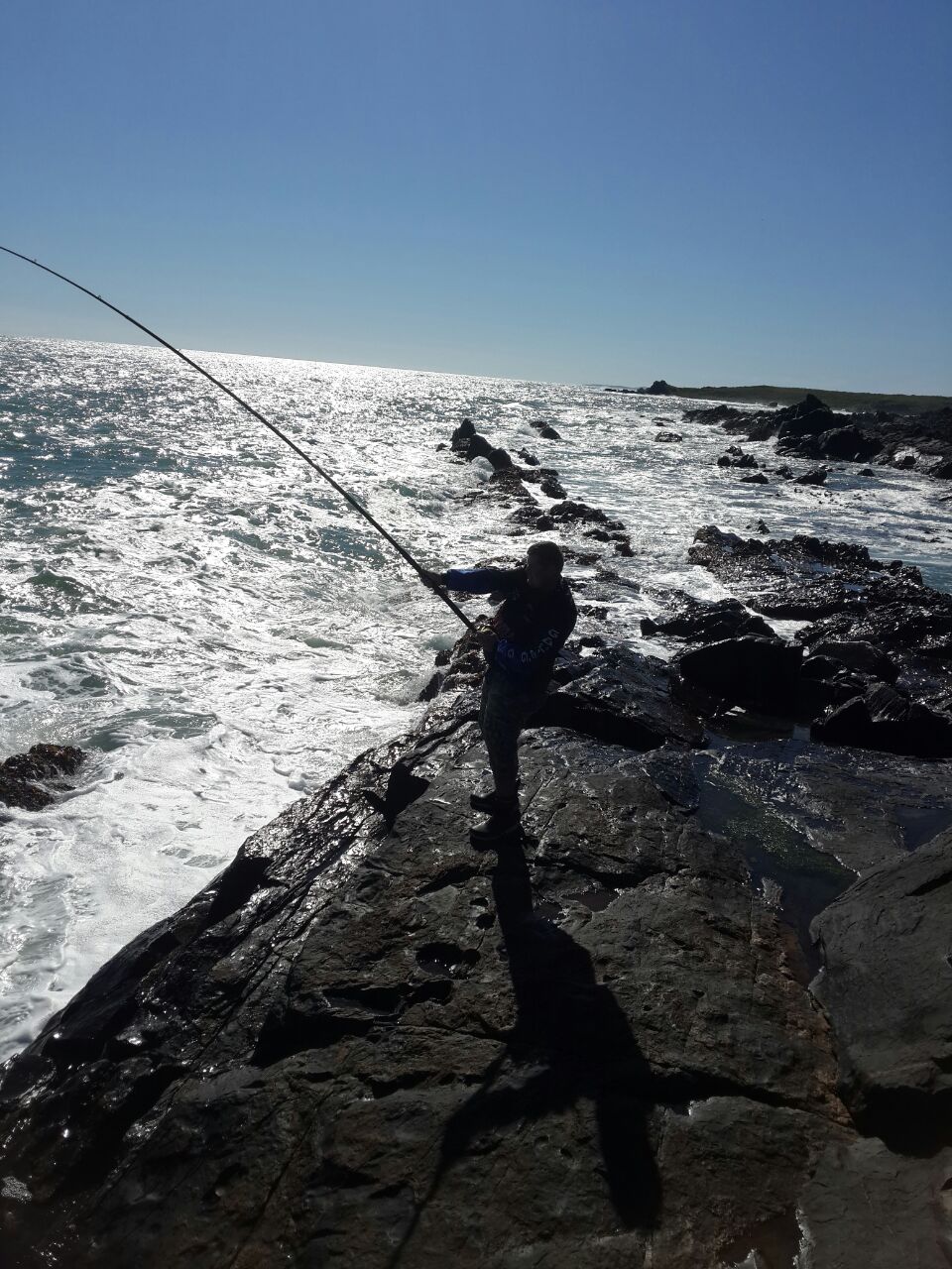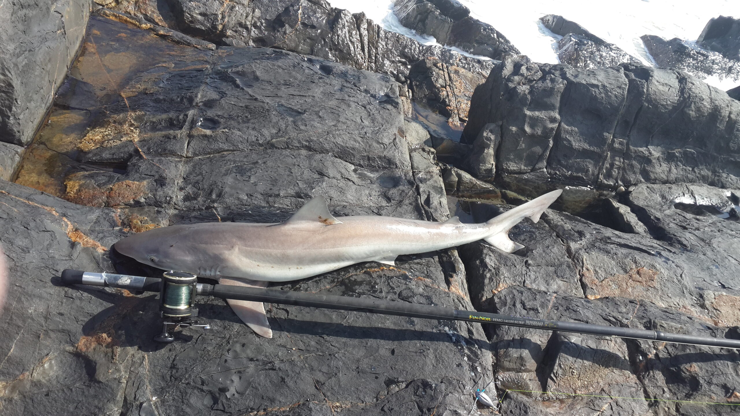 The Saturday I went out again, and managed to land about 20 soup fin sharks which were also released, but as this was not a new specie for me the search continued. I decided to try a bigger cast bait and used a big bull mullet wit some frigate tuna cutlets and 2 sardines inside out around it. I casted this monster bait about 65 to 70 meters out and put my rod in the rocks to go re pack my bait box when I realised I had some slack line. I picked the rod back up and felt something knocking my bait around it wasn’t long and line was screaming from my reel I fought this fiah for some time and finally managed to get it on the rocks it was a 7 gill cow shark and a new species for me .