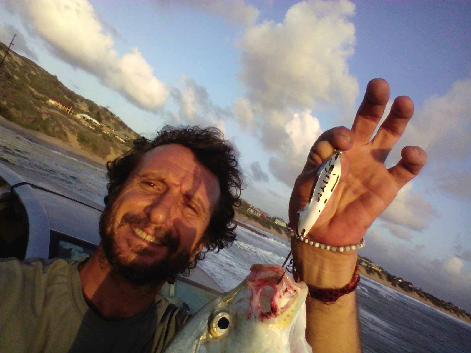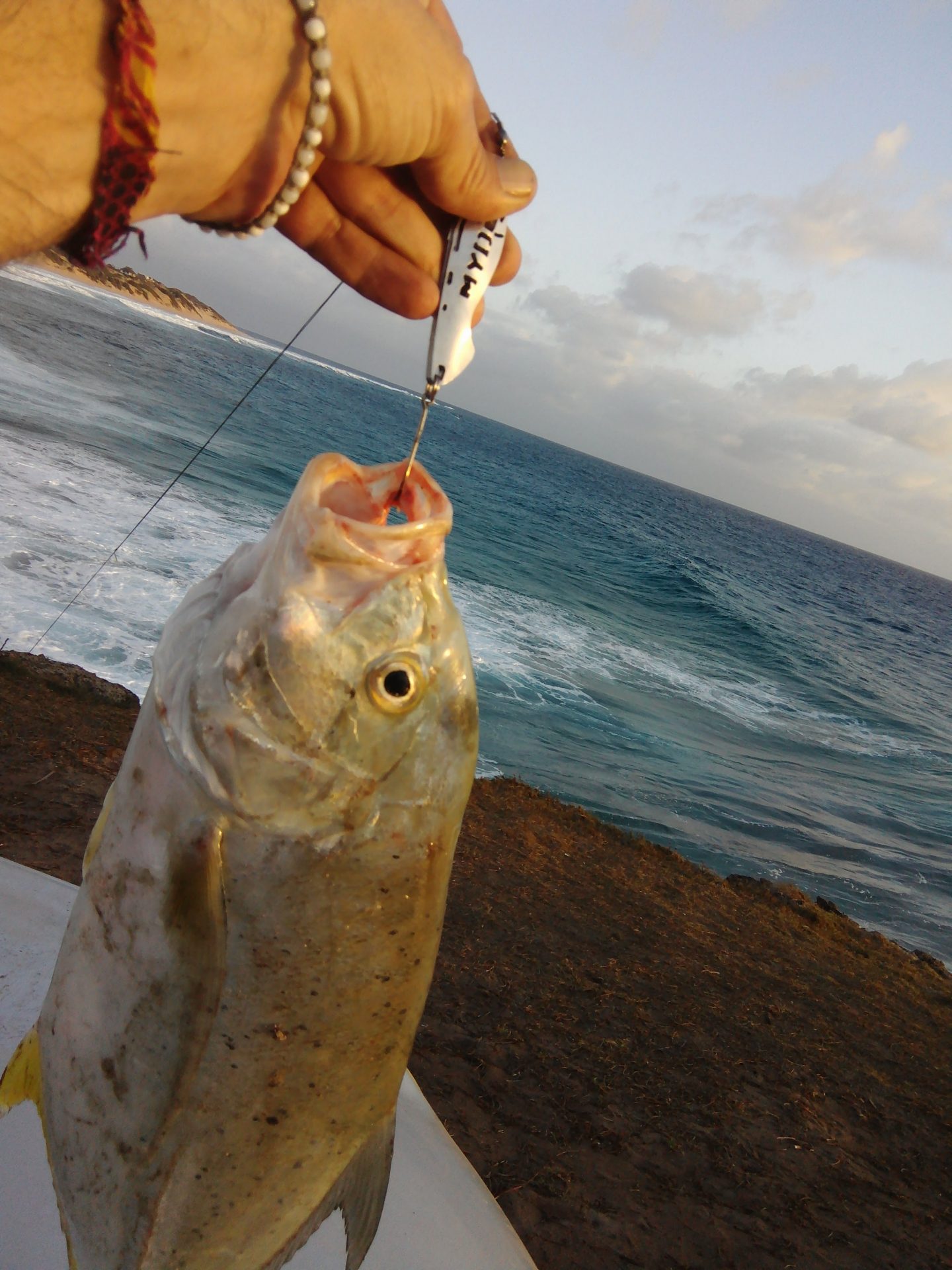 The swell was crashing over the ledge at Tofinho, but out back the water was crystal clear and warm looking. The south wind helped get my Mydo SS Spoon right over the backline, and soon I was settled into a nice pre-sun rhythm. A few days before, a really big fish had hit my spoon but didn’t hold on. Luckily, at this same point. I was really hoping for a smaller fish today. When the waves are this big, like 2 metres, it is nigh impossible to get down to the water’s edge, and retrieve your catch.