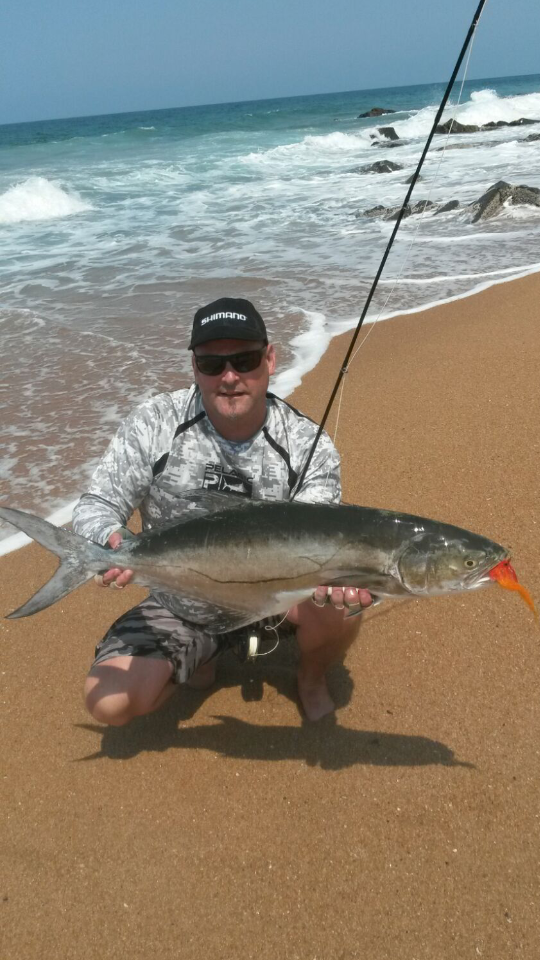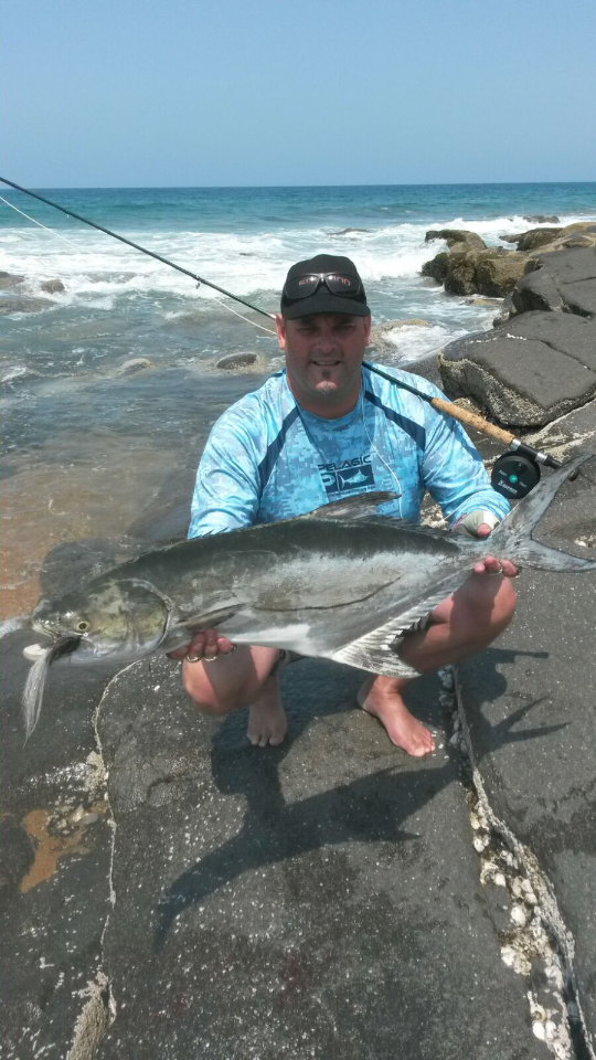 In September I flyfished a stretch on the KZN North Coast from the Tongaat River Mouth to Salmon Bay . It was a beautiful morning with a slight South westerly wind blowing – perfect because Garrick like to feed on SW.The water conditions where ideal too – the water was clean and the tide had just swung to a pushing tide.I had My Stealth 10/ 12 Wt Rod fitted with My XPLA 11 9/10 Wt Reel filled with Rio Tropics Surf Intermediate line.My favourite Garrick flies are the Lead headed – Ass Mullet tied on a 5 / 0 Mustard Hook,with a lead weight hidden in the Bucktail hair to ensure it sinks and to get that extra distance when you’re casting into the strike zone.I like using a red faced fly with Orange body in extremely clean, clear waters,and a grey-faced Lead headed – Ass Mullet with black body in less clean waters,a darker fly gives off a better silhouette in less visible water’s and more easier to see and smash it.