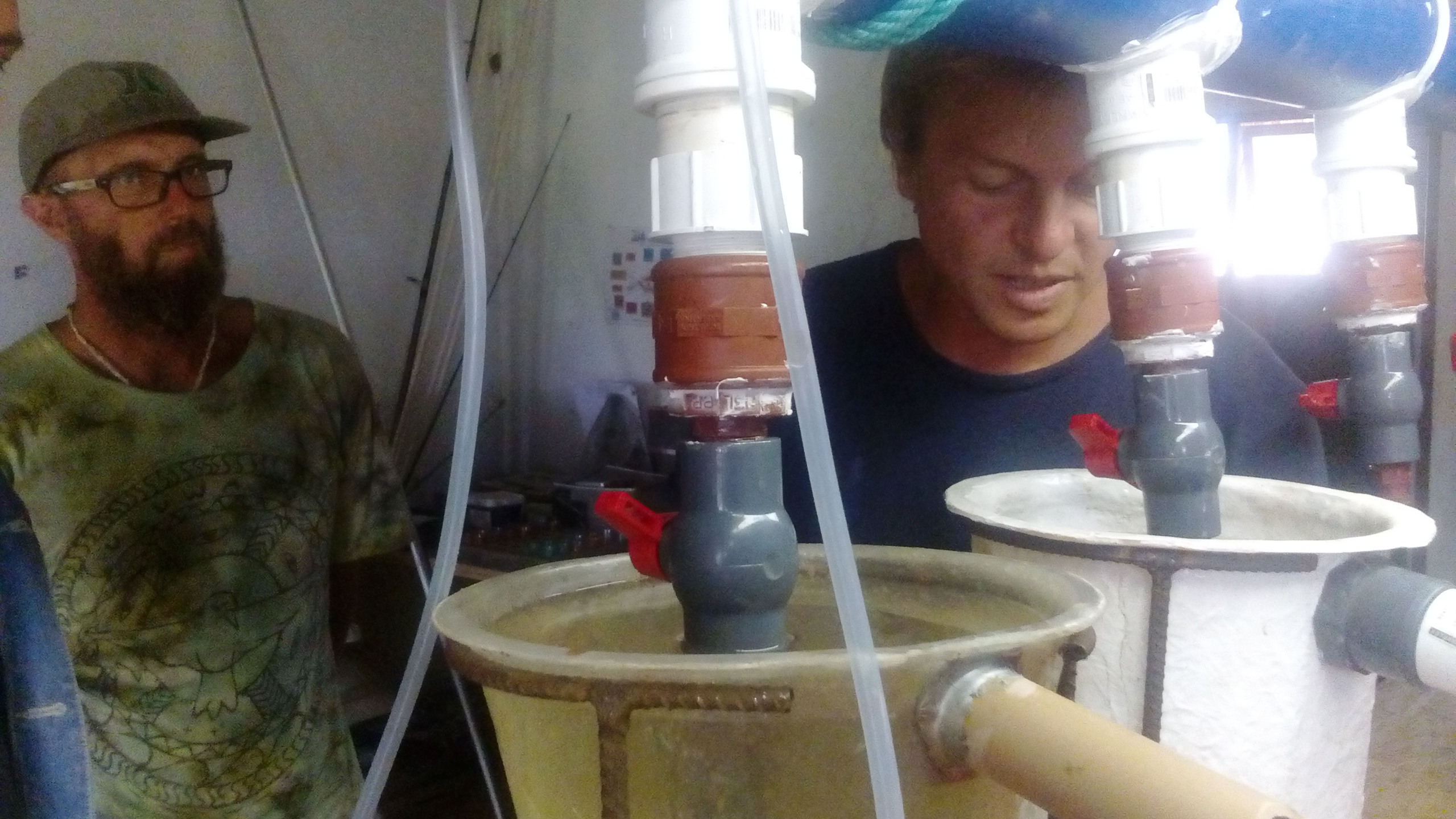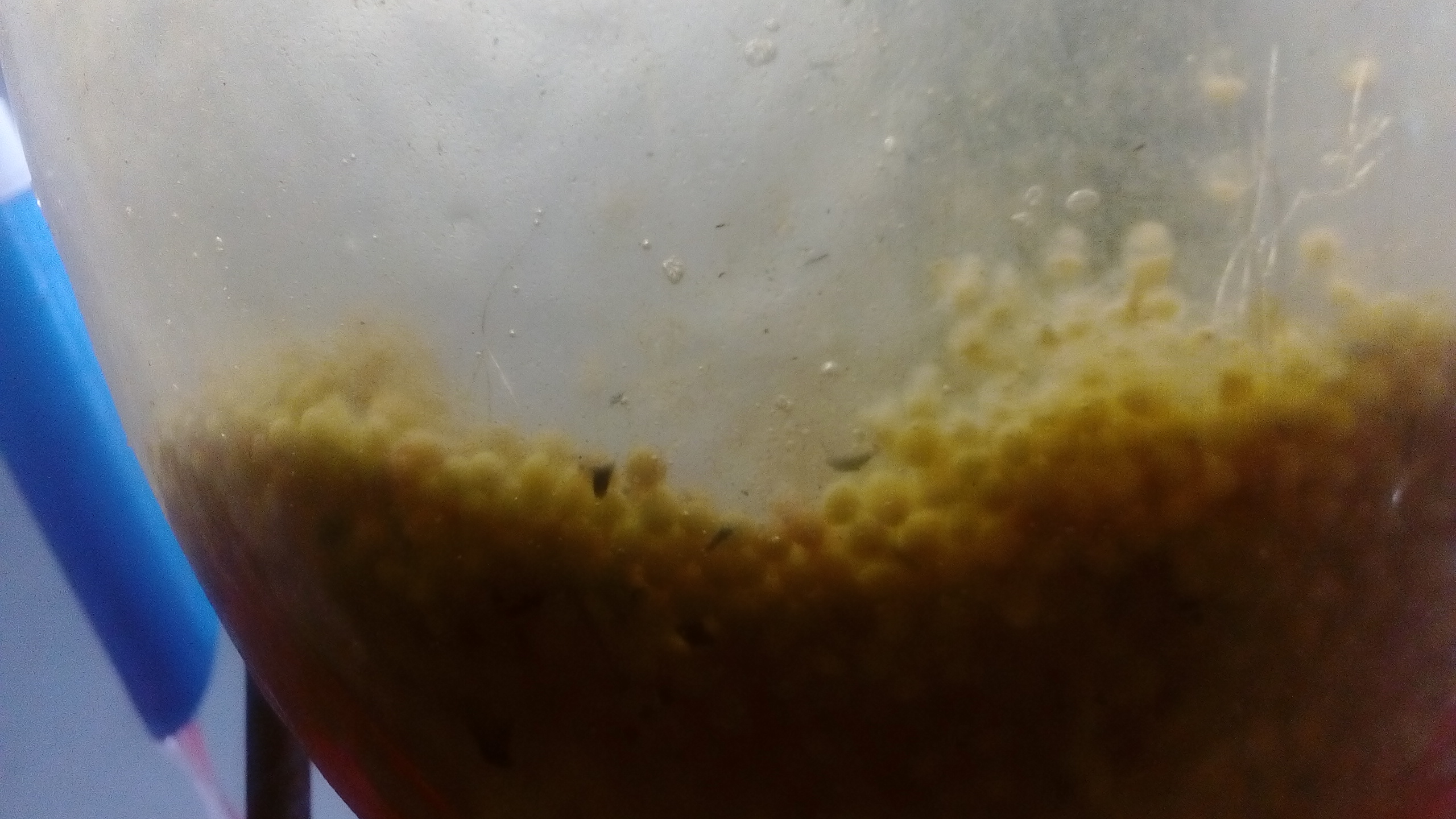 We started out in the brooding department. Tilapia are mouth brooders, so after the eggs have been harvested from the breeding fish tanks, they are placed in the mouth brooder simulator. Where after a day or so they grow eyes, and then a minuscule tail, as they eat through their start-up egg sacs. This ration lasts three days about, after which the 3mm fishies are moved to a juvenile tank.