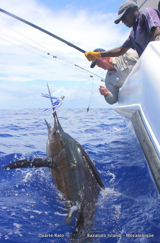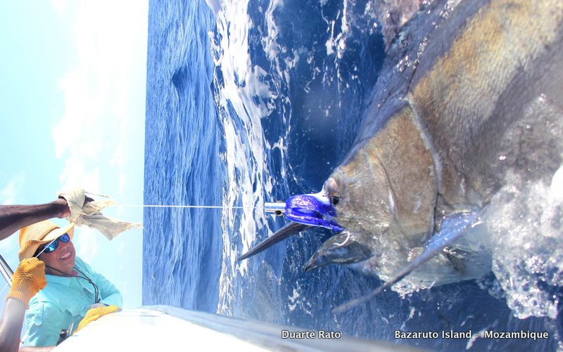 Our 5th day started up north at lighthouse and we had not set the spread for more than 15 minutes when both, the left short and long go simultaneously. What a sight as the two Marlin jumped in together in our wake and what pandemonium as we tried to clear the deck and make sure the lines did not cross over. After that initial chaos we had everything under control and we decided to deal with the smallest fish first which John was fighting stand up. We made short work of it and soon we had the 150 pounder by the boat, tagged it and let it go. Now it was time to deal with the bigger fish which Chrissie was fighting from the fighting chair. The fish was deep but as soon as we got on top of it and applied some more heat it come up and gave us an absolute fantastic jumping display in the beautiful morning light. We got it close to the boat but it was a hard fish and with 40 pounds of drag (as much as Chrissie wanted to go) it still took us another 10 minutes to get it under control by the side of the bat for some photos. We eventually let it go and called it 400 pounds. What a start to the day!!!