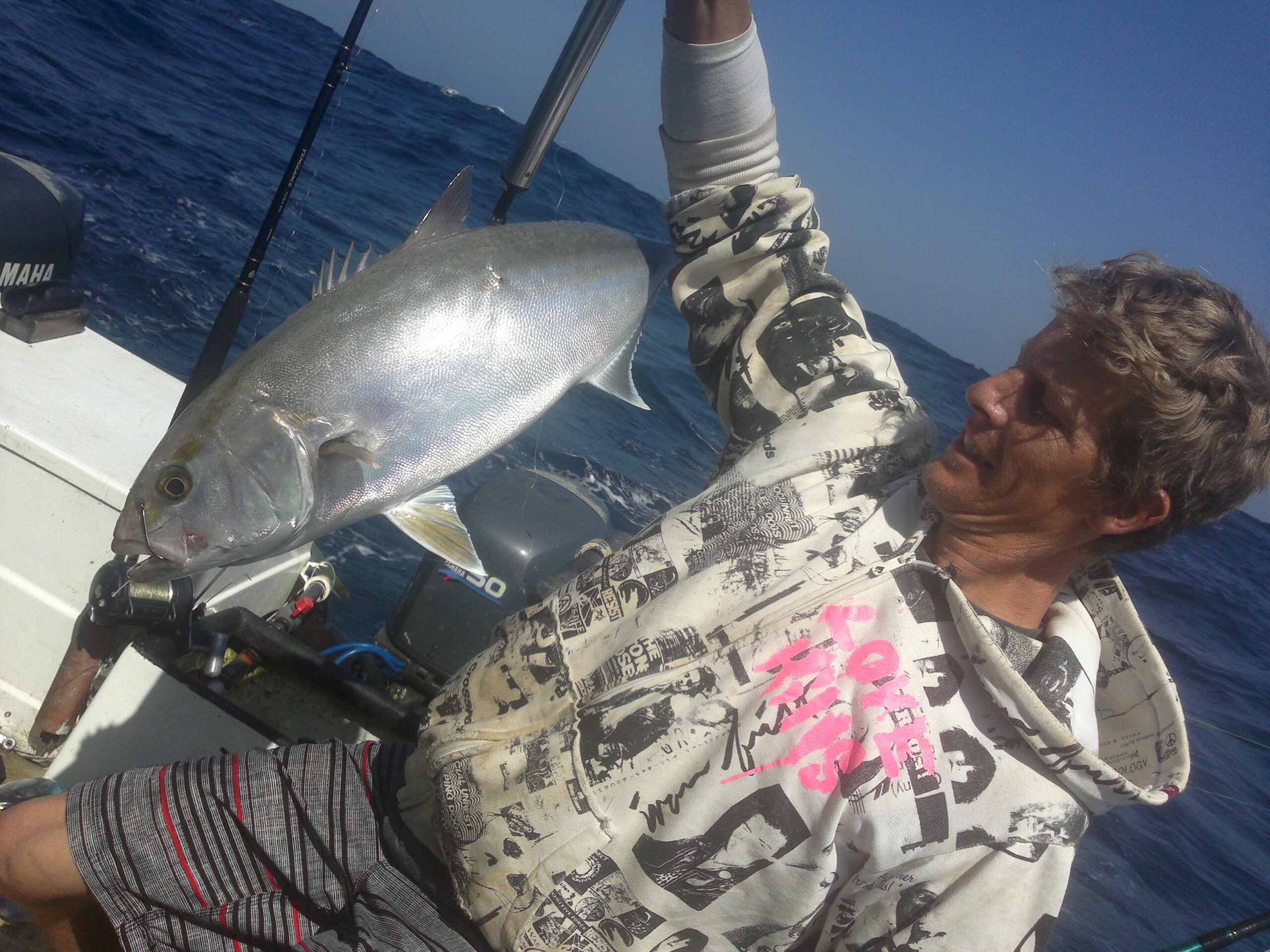 It started out smooth and calm, with a nice launch at 7:30am, but soon the beasterly easterly started to whisper. Captain Brian Lange at the helm of Niteshift, from the Umzimkulu Marina, was driving, with John van Reenen and Sean Lange as crew. By the time we had 10 livies, it was up to 15 knots, but since the tide had run out half, we were stuck out there for the next 6 hours! The ride to Protea was like being in a skatepark, and when we got there, the wind was up to 20. But, there was very little current and we only had to deal with wind drift really – staying on the reef was easy. But the fish weren’t there. Our livebaits stayed live and the wind picked up even more.