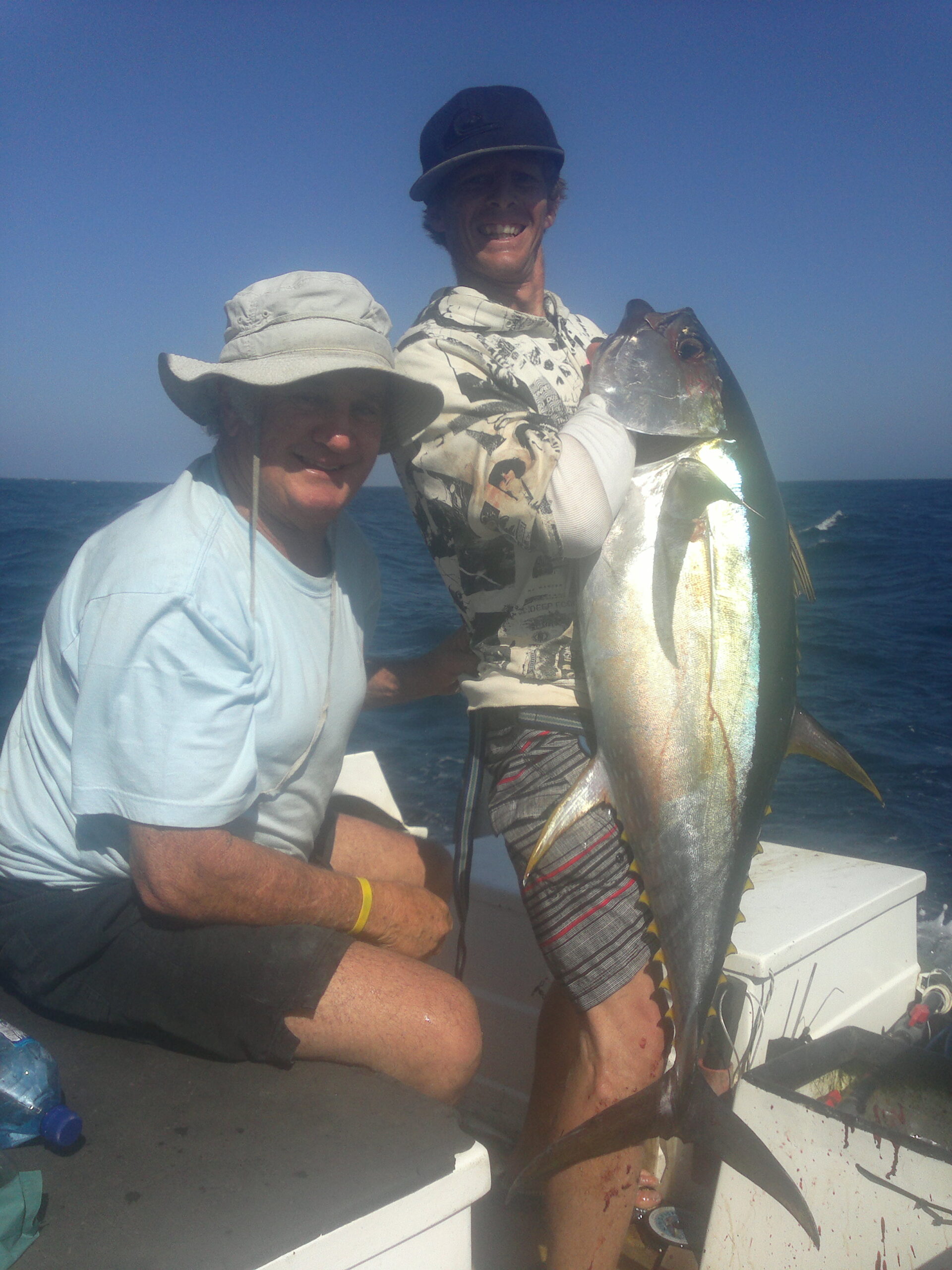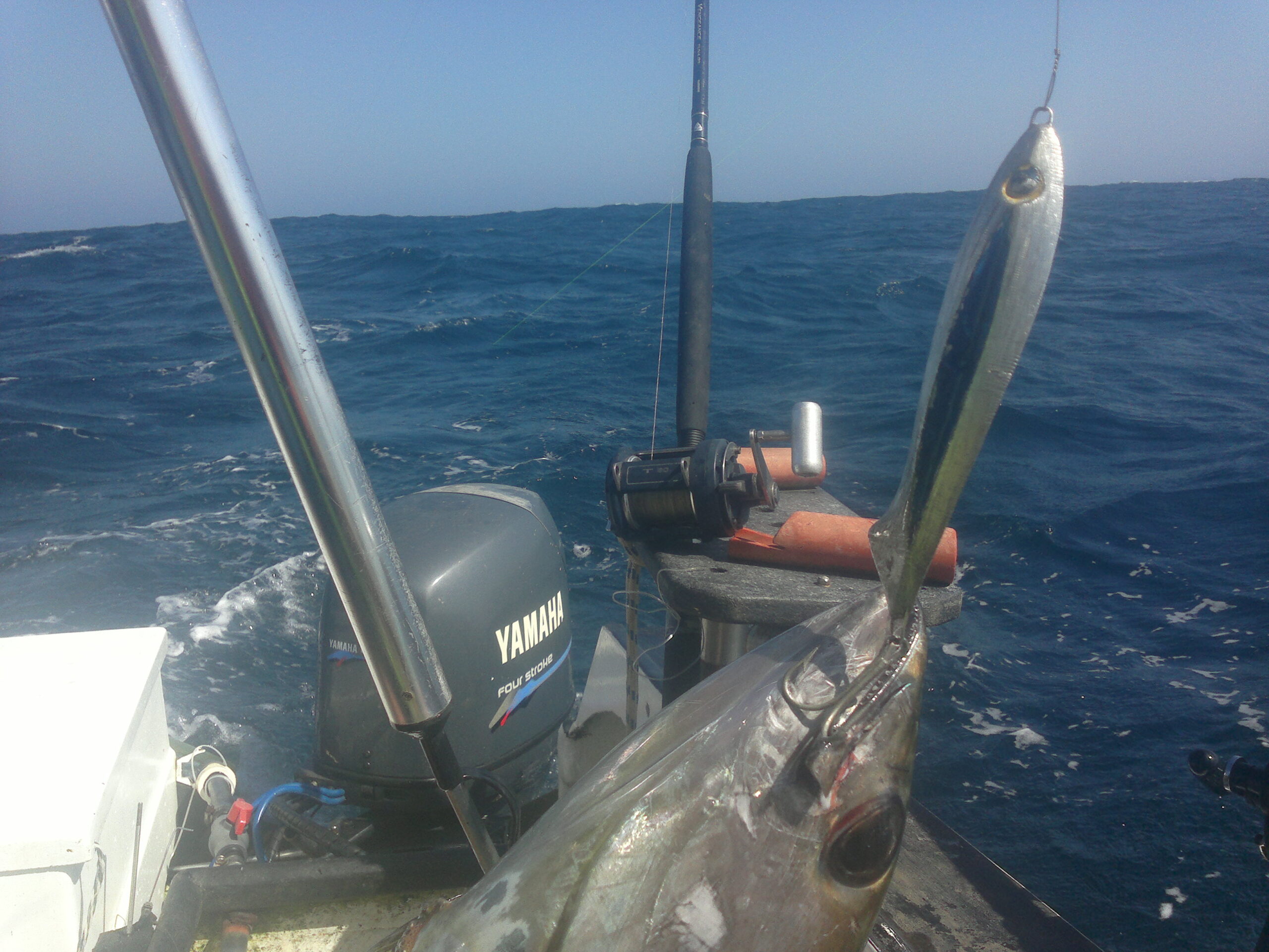 It was rough going on the anchor, with the boat going half airborne sometimes…we got a huge Bonito, an Amberjack…on the bottom with the livebaits, and then it happened. Tuna! Yellowfin! Coming up behind us. The home-made plug and the Mydo spoon went flying with the east gale, and both went away as they hit the water. Some 25kg class mixed up with football sized. Luckily we got a few smaller ones to start with, as the gas bottles hammered us…first the popper got annihilated, then the Mydo spoon… John van Reenen had his eye on the Okuma T30 as it started to growl…’wicked tuna’ style…he set the drag to max and strapped in. 30 Gruelling minutes, many close calls and two gaffing attempts later…one gaff got the tuna by the tail and the second gaff swung in…O.D.B…on da boat! So it was a great day…an awesome catch in the end…goes to show what Captain Paul Cook preaches…’Fishing is like school…good marks for good attendance…!’