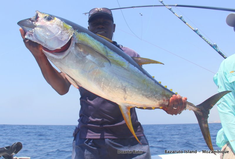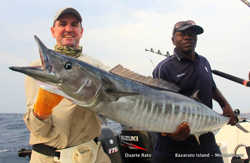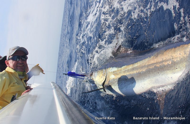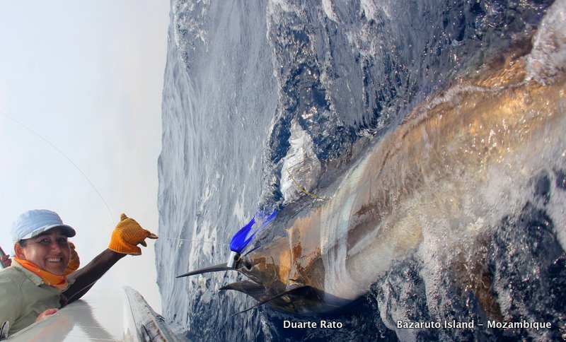 A few months ago Brenda contacted me that she wanted to book a trip to bazaruto for 3 days of Marlin fishing, a birthday present for her Husband Andrew who had never caught a marlin. Our first day was the 20th October and we caught a wahoo and a couple yellowfin as we made our way north. As soon as we got to lighthouse the water looked phenomenal and there were loads of baitfish and we started catching tuna after tuna and while working that school our long rigger lure was taken and we hooked up to a 250 pound Marlin. Andrew got in the chair and brought it in for his first ever Marlin. Spirits were high and we missed a wahoo and a sailfish but an hour later hooked up again to a Marlin of similar size and this time Brenda got in the chair. Unfortunelty we hooked the fish shallow and it got sharked very close to the boat. On the process the shark got hooked and after an hour of extreme heat with the reel on sunset we released one of the biggest Zambezi´s we have seen here at around 700 pounds. We had a very strong NE wind on the second day and the water went off color. We never saw a marlin but got some nice gamefish including a 21 kg YFT. We only fished a half day on the third day as a big front was moving in, but what an action full morning it was. Early on Andrew got a 21 kg wahoo on the bait sticks, the we missed another good wahoo bite and a Marlin that just knocked the lure. We then caught a 16 kg wahoo on a bait stick and missed one on a lure. We then lost another wahoo and got 2 YFT: I put them out as live bait and within 30 seconds one was eaten but it proved to be a shark that bit through the mono leader after 20 minutes. The other bait was also taken by a shark a tad later. Time was running out and the wind started to blow so I headed to an area I nicknamed Giant´s corner on the bottom end of V mile reef. As soon as we got there a fish about 600 pounds come in on the short lure and followed it for ages before fading without a touch.