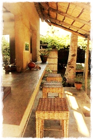 The gardens are filled with features and right in the middle, is the fire pit and boma. Where you can lose yourself completely on a starry night. The accommodations are a cool blend of bricks and mortar, and local materials, like reeds and chappas (corrugated roof sheets). The en suite bathrooms are roofed only by the stars and palm trees.