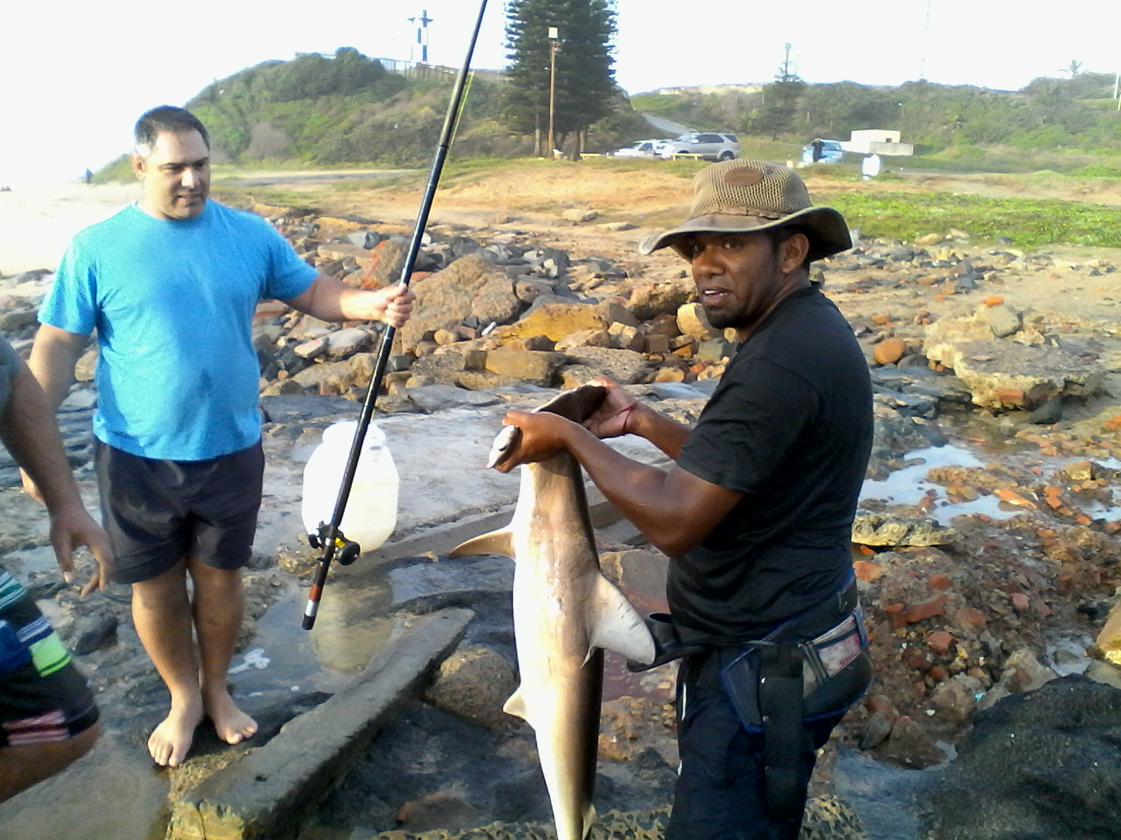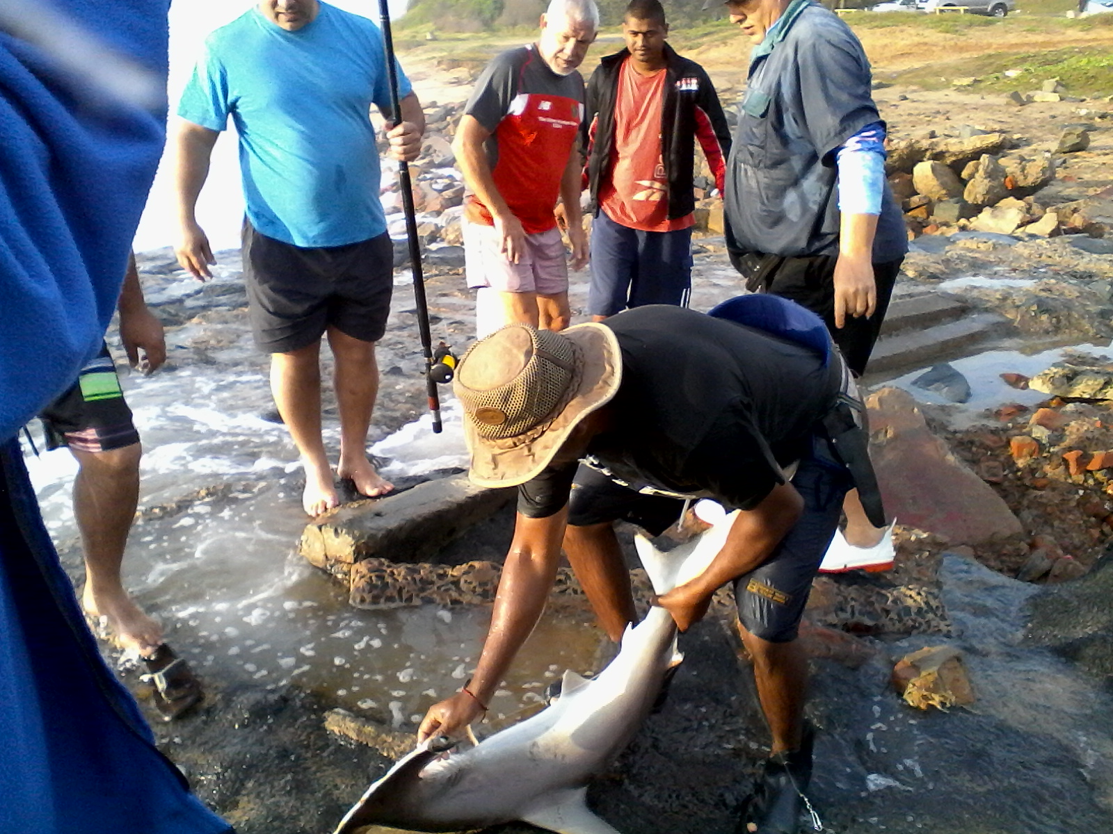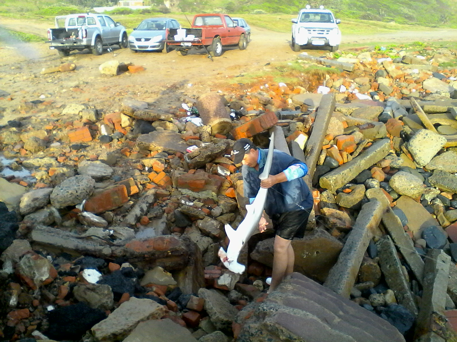 The fish was taken on a live mullet and screamed off on it’s first run, steam train style. The outsized wintery waves proved to be a true challenge as some were breaking right over Pooven – as he had to stand and just take it on the head, whilst he negotiated a truce with the grumpy shark. A crowd had gathered by now and support was being shouted in from all sides – world cup fever spilling over…