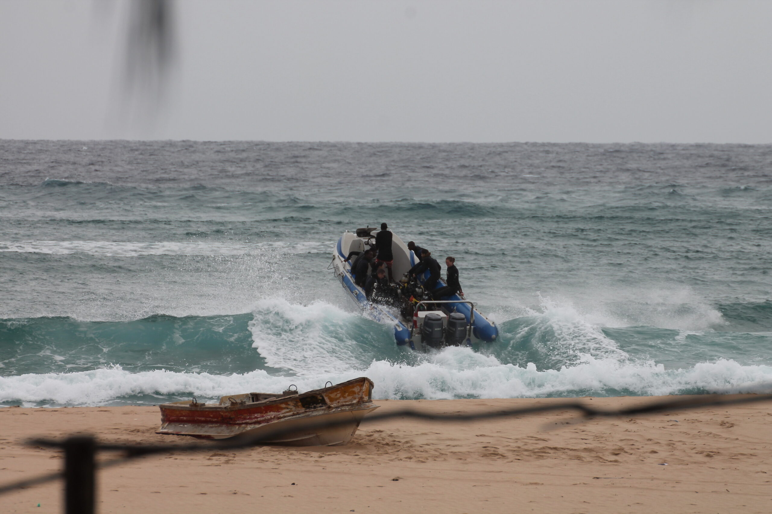 The shore break here does get bigger than this. Way bigger. But even at this size, one false move and there could be disaster. The three assistants in the water with the divers perform the most vital role of keeping the bow of the boat facing directly into the oncoming waves. No matter what the size of the surf is.