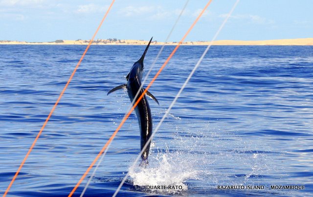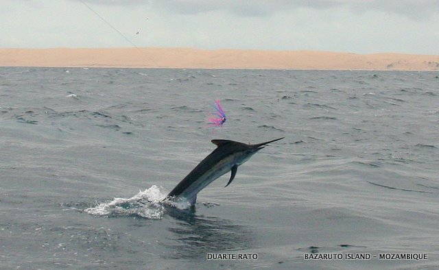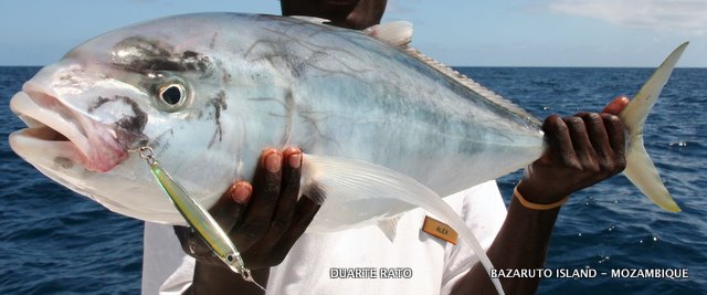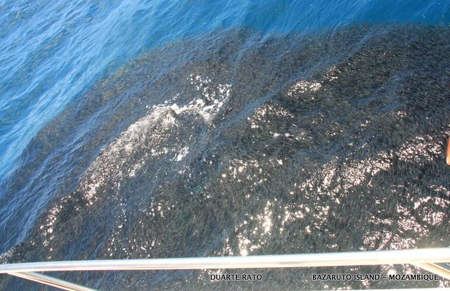 On top of it looking like Whales gorging down plankton were Dusky, Blackfin and huge Zambeze sharks munching on them. They would just open their mouths and gulp down zillions of the tiny poor anchovies by the gulp. We pulled in the big lures, stopped up wind and just drifted into this awesome exhibition of nature. And when we got on top of it we were simply dumb fouled to see the mayhem of game fish feeding below. There were big eye and bludger kingfish, amberjack´s, bonito´s and yellowfin tuna by their thousands. The excitement on board went to new levels as everyone run for the jigging and spinning outfits. It was every men for himself as spoons and poppers were flying, jigs going deep and even baits going overboard. Time after time everyone onboard, including myself and my two deckhands, hooked up simultaneously time after time.