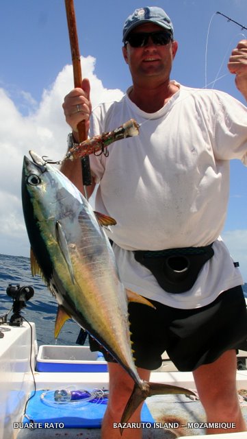 We missed a 300 early morning on a lure @ VI mile yesterday. Then had 3 YFT baits sharked, catching one of the dusky´s before heading for shelter. Big SE blowing so we probably not fishing next two days, hopefully it will sort the greenish water out!!!