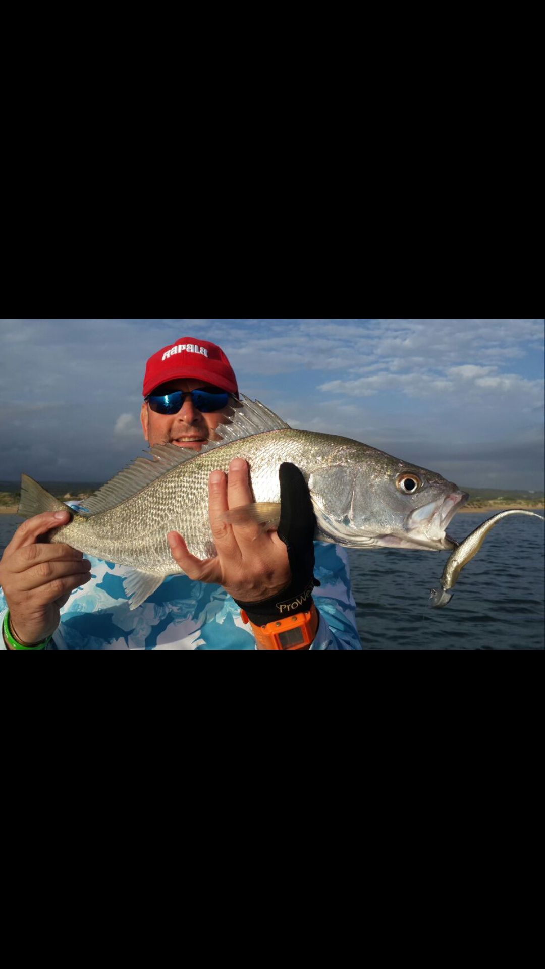 The next few days would be perfect. My mate Mervyn , Gene and I launched the boat and headed to a spot called Granse’s – the deepest part of the estuary. We anchored and set up our equiment to start drop shotting on the pushing in tide which wasthe perfect time to target these magnificent Game fish.I was using my 7ft Shimano Crucial Medium Heavy fitted witha Shimano Susutian 3000,with 15lb Gosen Braid and using a 3/4oz Nitro Lead Jig Head fitted with a 5′ Berkley Sardine. I tossed my presentation overboard and allowed it to sink to the bottom before starting my retrieve – a slight tweak, lift up and dropping the lure onto the bottom again, tweak again and drop it to the bottom with a slow retrieve which is the best way to catch thee attention of a Kob.