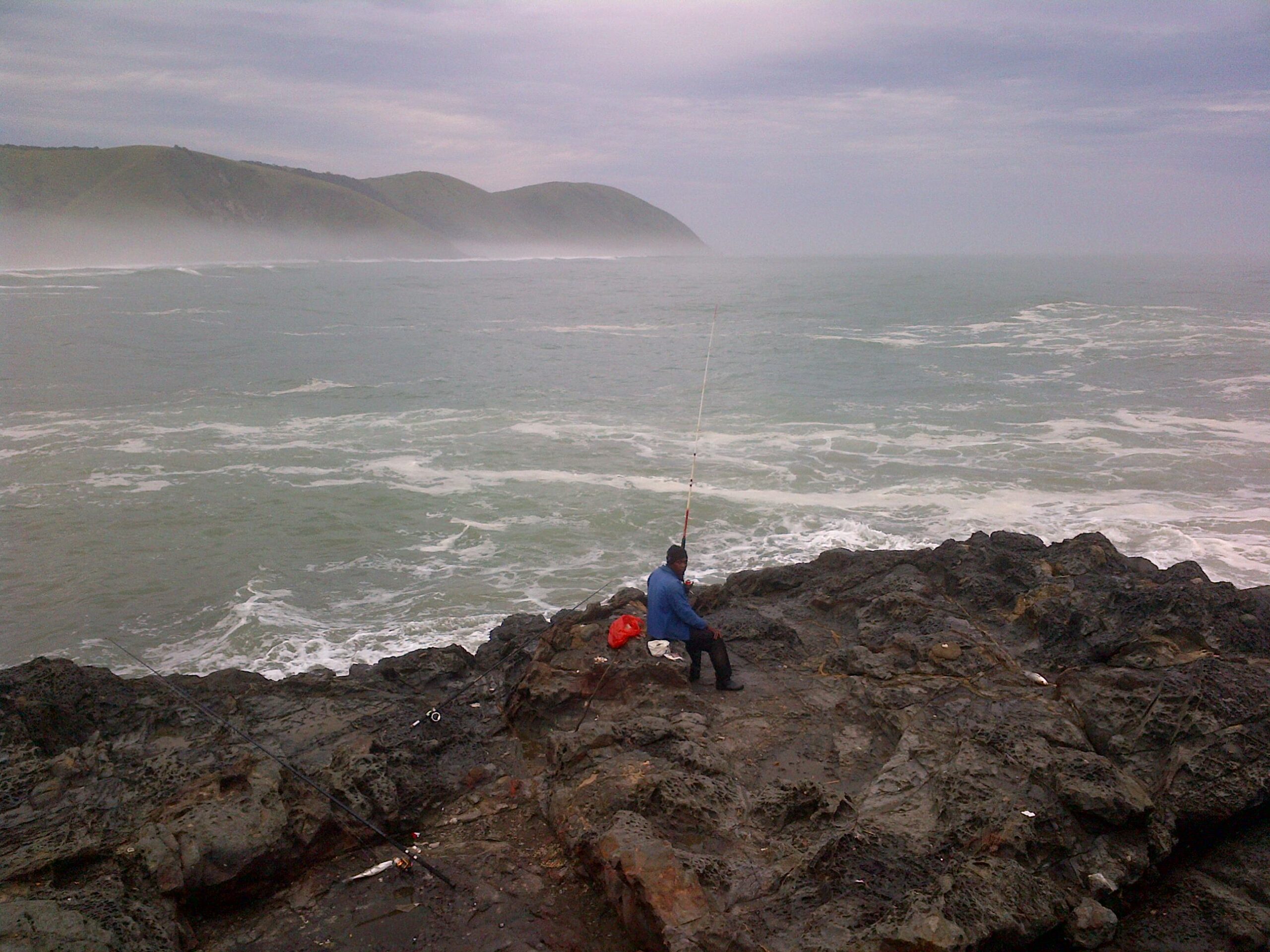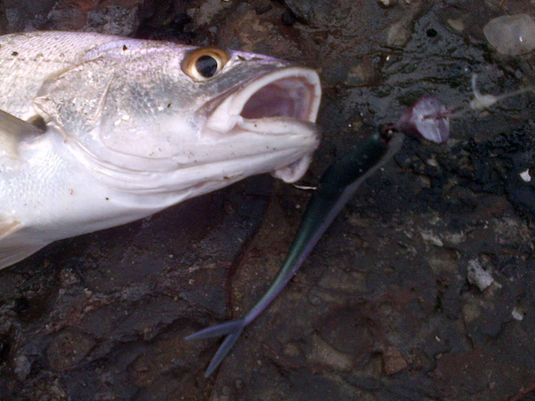 The local dude on the rocks fishing for kob at Poenskop was stocking up on live pinkies. It was about 4pm and after casting plastics all day – only enticed a few shad to strike, destroying my 5 inch bullheads and forktails. It was an overcast day and even showered some and the water was off clear -so after all the propoganda about which colours to use when and where, decided to forego my luminous eighties style colours and thread on a real dark model from MacCarthy. I was also after a kob.