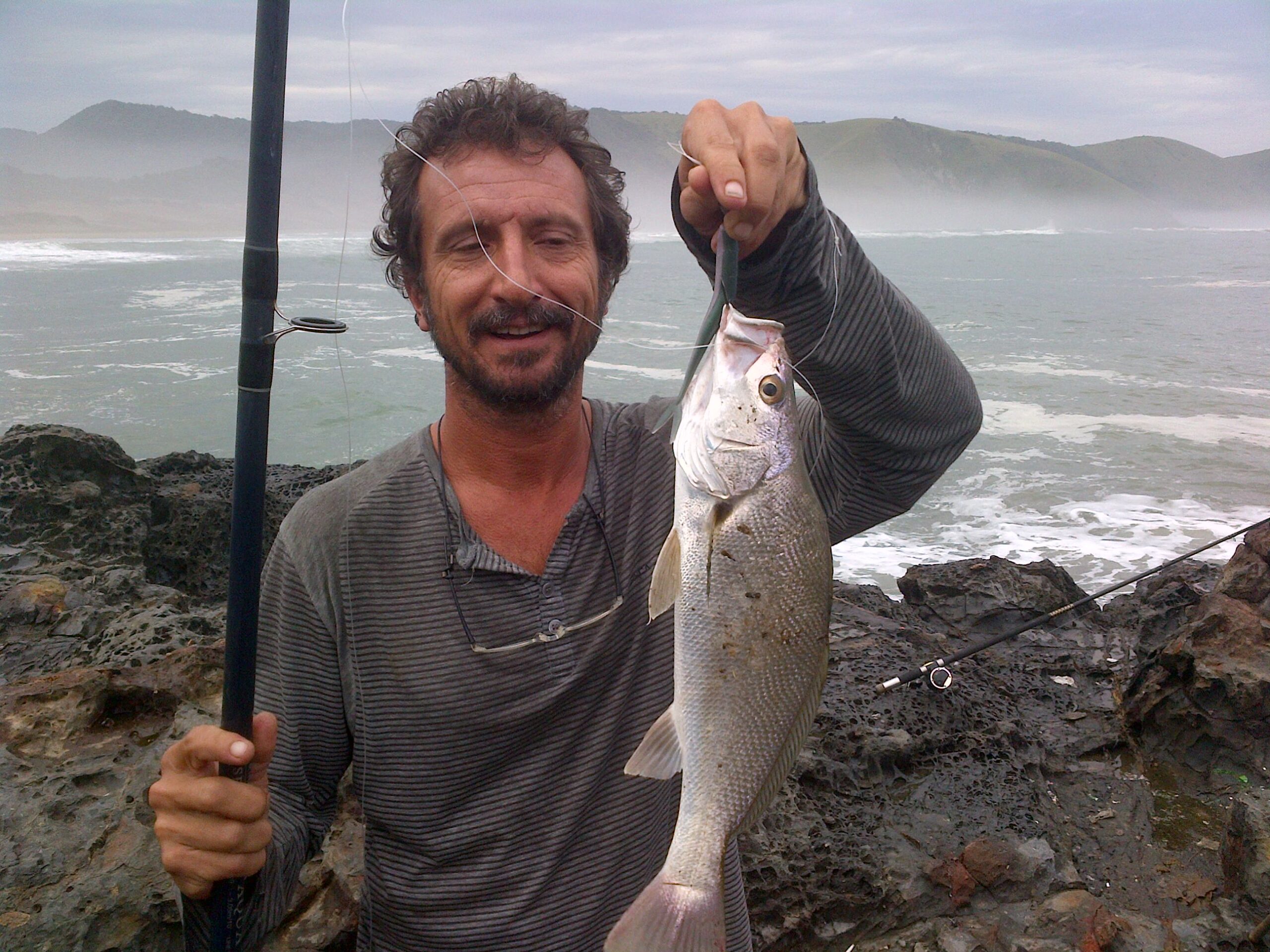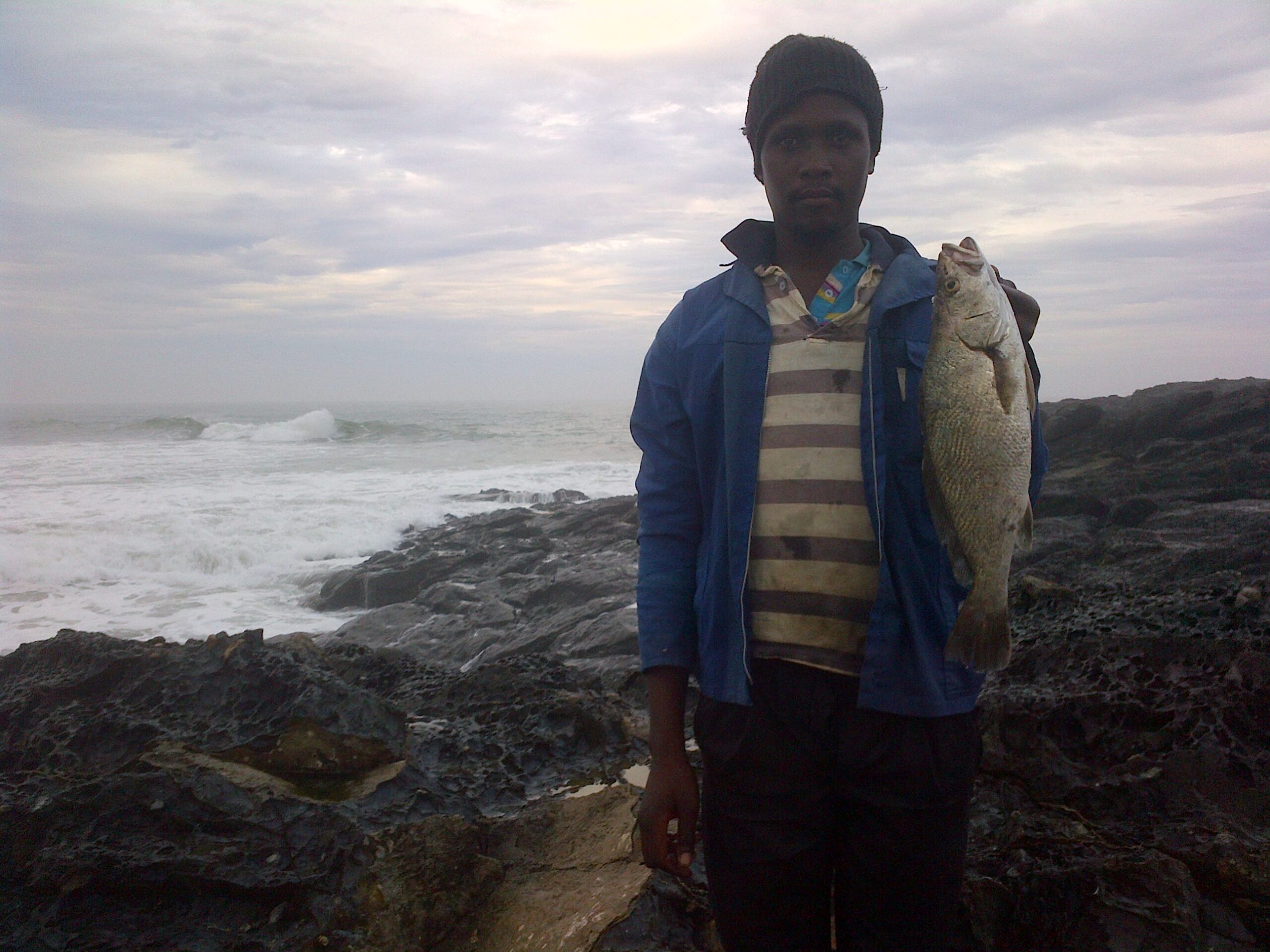 So I shouldered up to Thulani the local subsistence professional, with his pink and red estuary rod but over sized Penn coffee grinder fully loaded with heavy white nylon and now a livebait trace. It wasn’t 20 minutes and his rod tip started dancing about the sky and he was vas. Not a big fish, but from way out there where he had cast, it was quite a tussle. The fish seemed to congregate around a big bombie about 30 metres out. It was swirling with white water – the perfect ambush spot for kob.