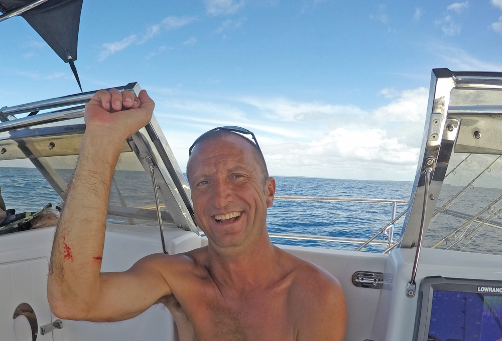 Trying to get a photo of the wahoo whilst it still had it’s lights on, I hoisted the fish and got whacked in the arm by it’s tiny front teeth, never mind the lashers further back, where my other hand was – trying to control the angry animal.