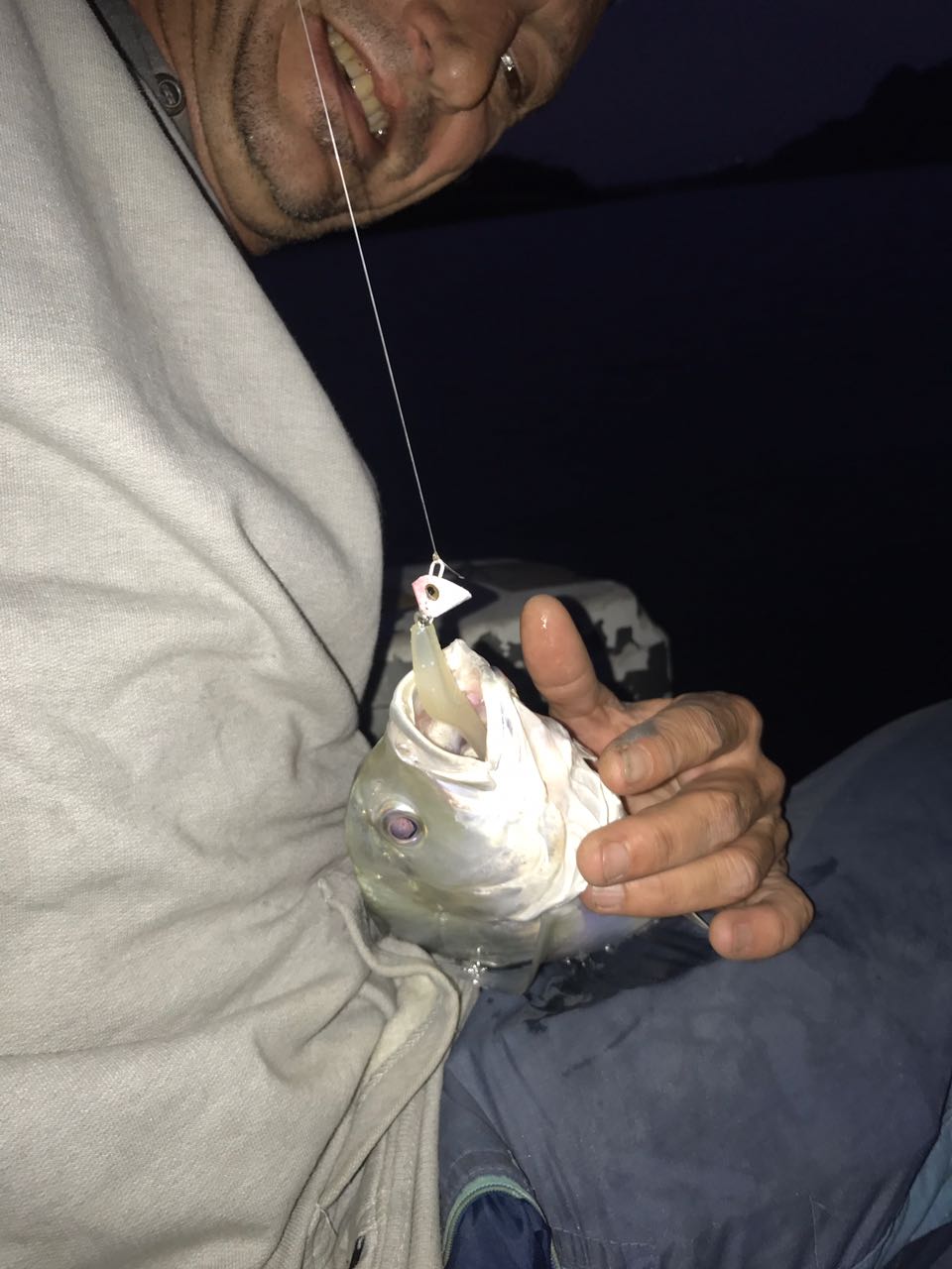 The first charter I had for July, Yousef,  caught his kingfish after only a hundred metres of fishing! On the Rapala! It was a good fighting sized baby GT, spirited as only one hook held him by the top of his head. Making for some serious negotiating. Luckily that skin on top there is tough as hell, and the fish came to the boat eventually. Still throwing a tantrum! But we soon had the photos and him back in the water. That was the only kingfish on that trip. The rest of the evening we targeted spotted grunter successfully. Even taking a nice big one back to be curry for Yousef, my guest.