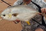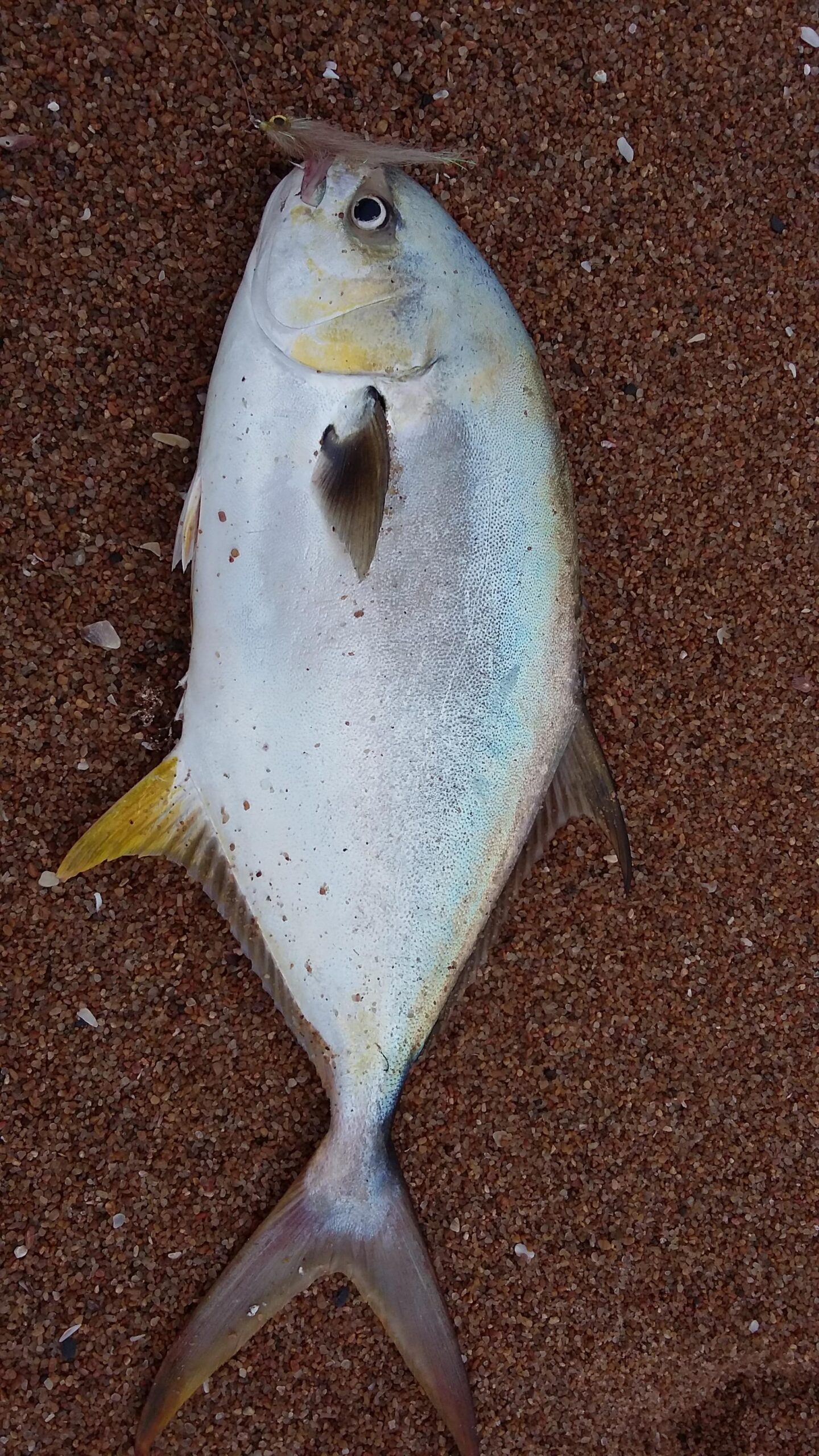 Now I was getting a wee bit not impressed with this fish tiered and sore from the Spinning the day before and this morning I just wanted to land and see what fishI had hooked into, I started retrieving line in quickly before it decieded to get a 3rd wind in I held the rod up and cranked that Expla reel getting the better finally of this fish I was so desprate to see.I kept at it retrieving more of my line back and pulling it closer to the shore break with my 9Wt rod bending nicely with the force of the fish on thee other end was a good site to see in front of me….I had a few more burst from this chap he was’nt givng up without a epic fight slowly slowly I started bringing this fella in the closer I could see the Boykie,as the white water cleared in front of me I finally got to see my fish I had caught a Natal Pompano roughly about 5 kilo’s I was stoked my first Pompano on fly it’s as close as you can get to fishing the flats for Permit on fly in the Tropic’s……!!!