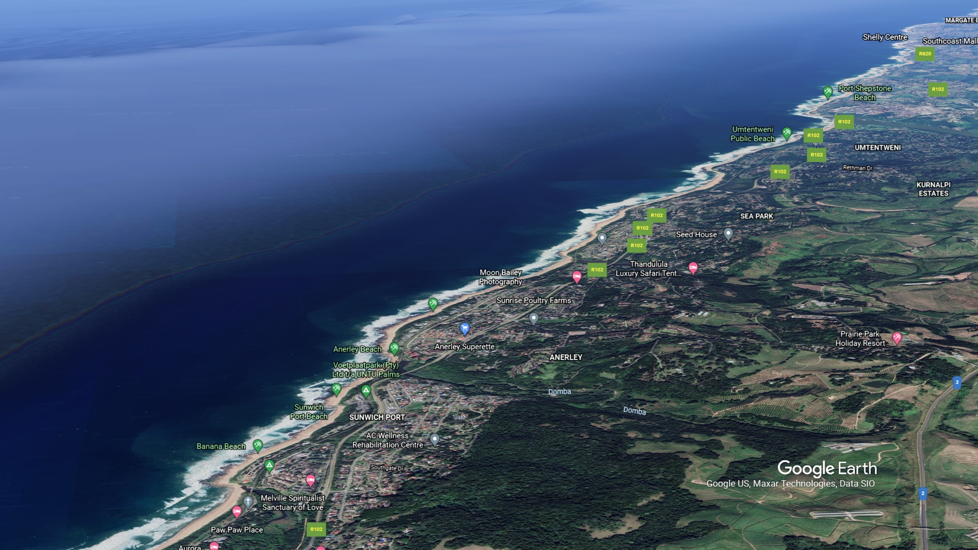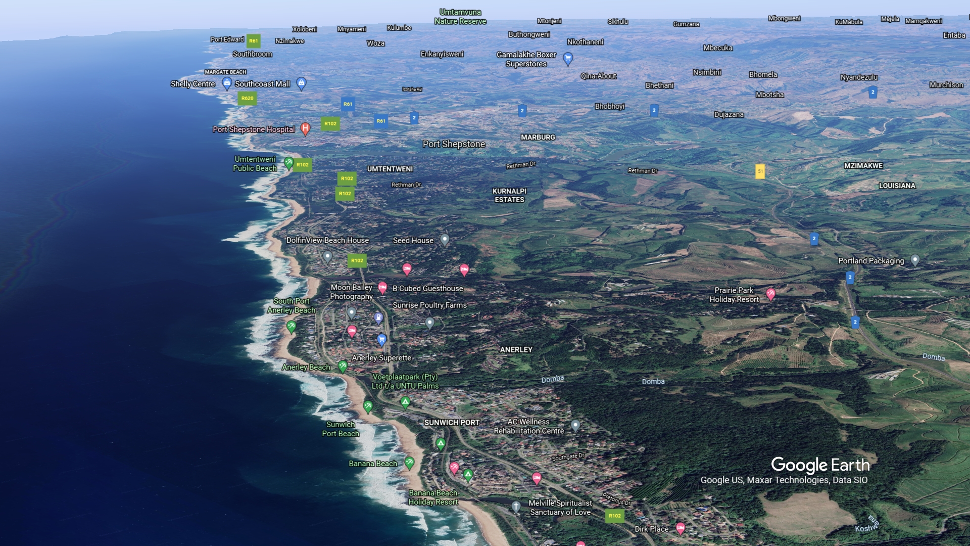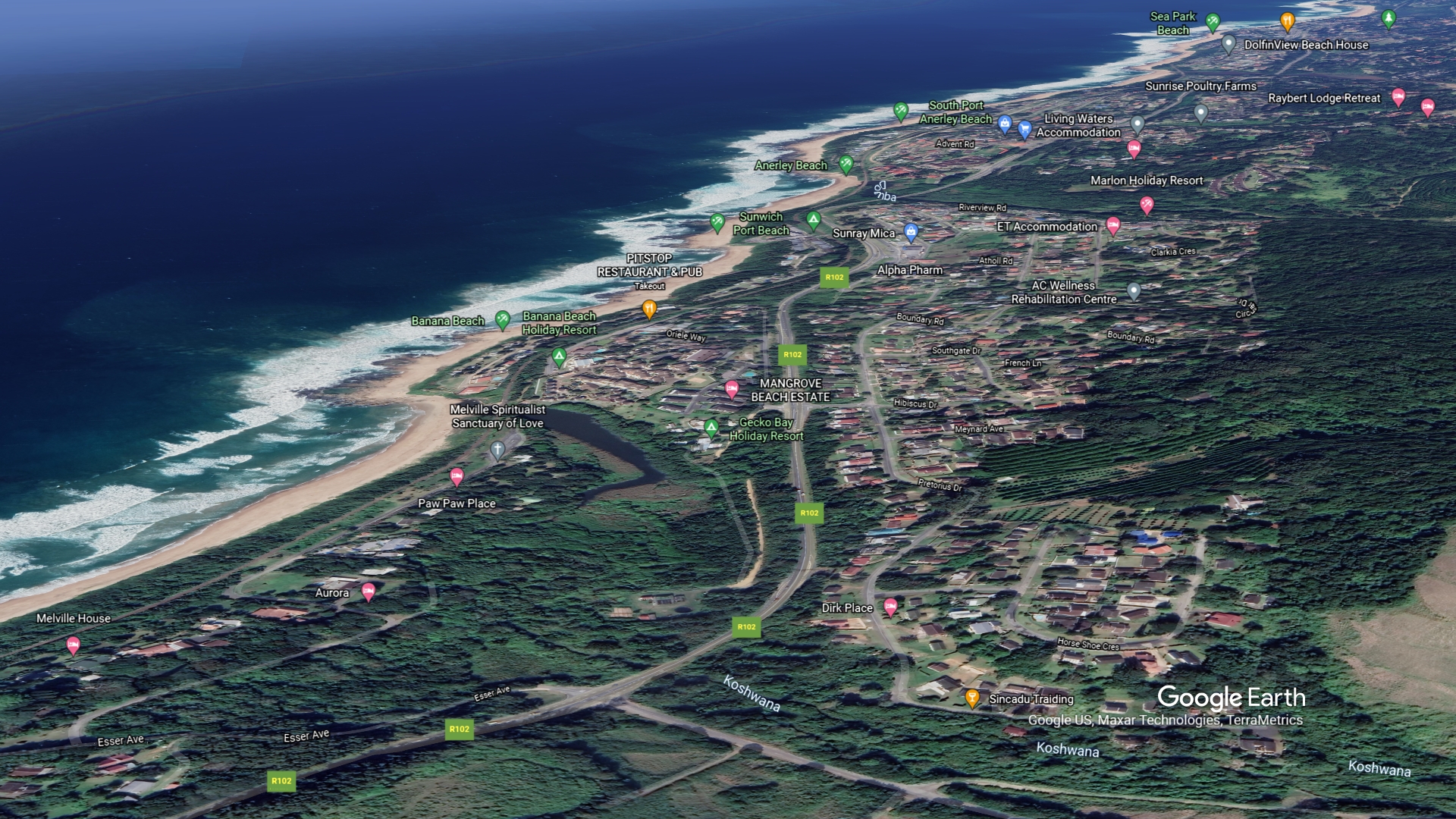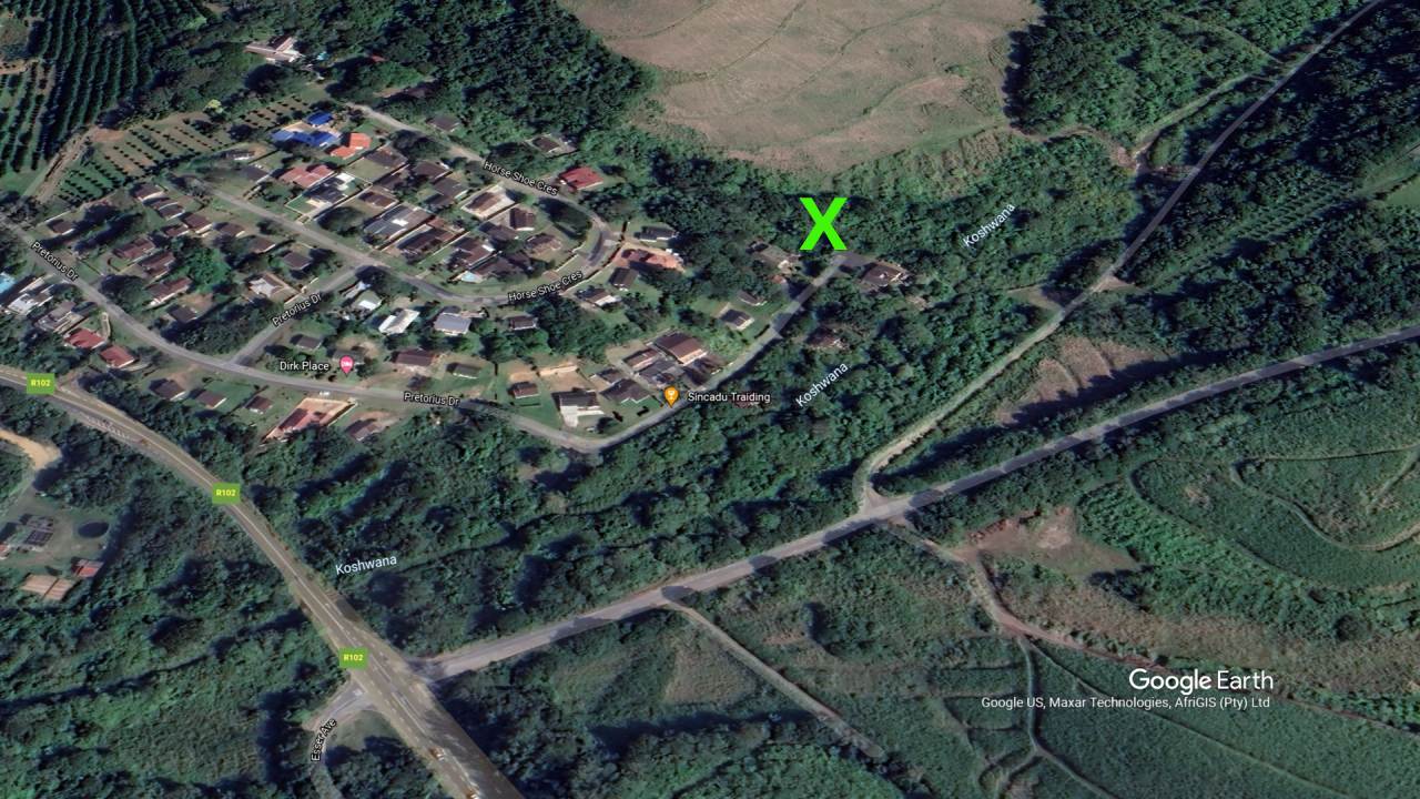 Head south from Durban, coming off the N1 at Hibberdene. Meander the coast road south until it says Melville. Skip the first turnoff (Banana Beach north carpark), take the second, but turn left inland (if you turn right to the ocean you end up at the south beach car park). Turn right almost immediately (north) and at the end of that road is the piece of jungle for sale.