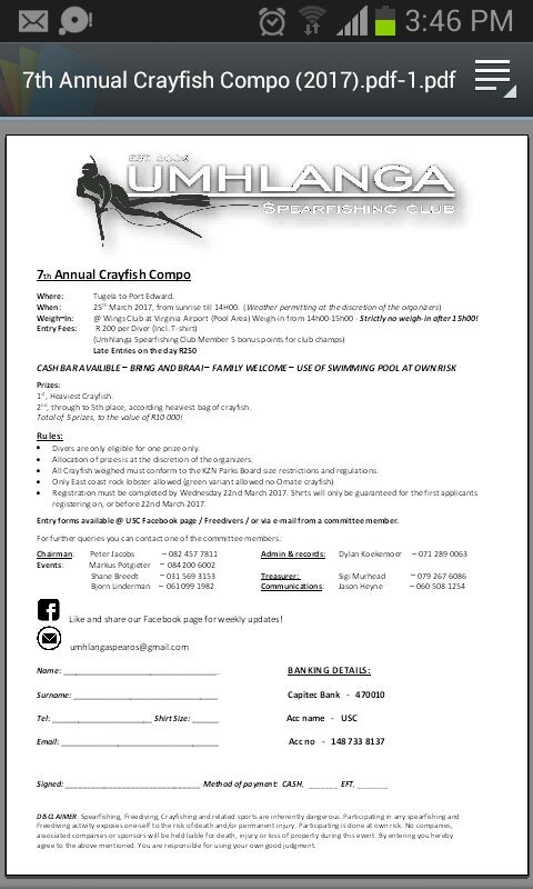 Conditions this week have been well below average. With the southwest on Wednesday and Thursday the sea started coming right but the northeast today mixed it up again. Saturday a light northeast blows in the morning switching to a moderate southwest in the afternoon with the swell running at 2m most of the day. Sunday morning the southwest continues to blow dropping off later in the day and so does the swell from 1.8m to 1.4m late afternoon. So if you don’t mind big swell Saturday morning looks like a possibility for a dive. No fish to report on and no viz reported both north and south coasts. Just a reminder our crayfish comp is on for next week Saturday the 25th get your entries in soon to guarantee a shirt! As always dive safe and straight spears