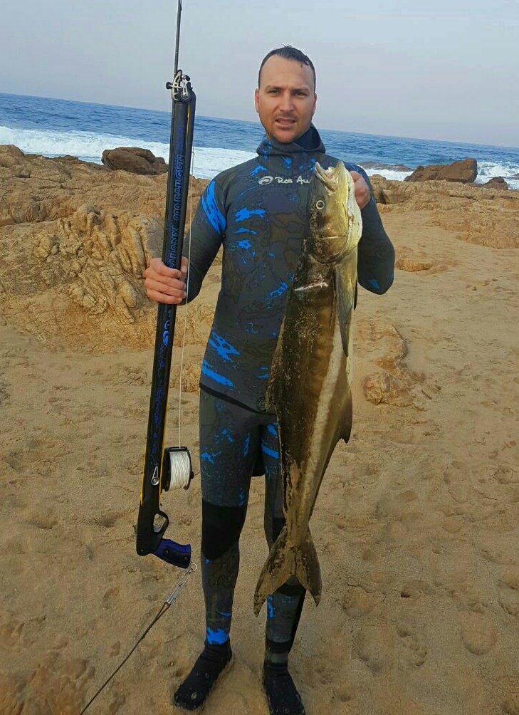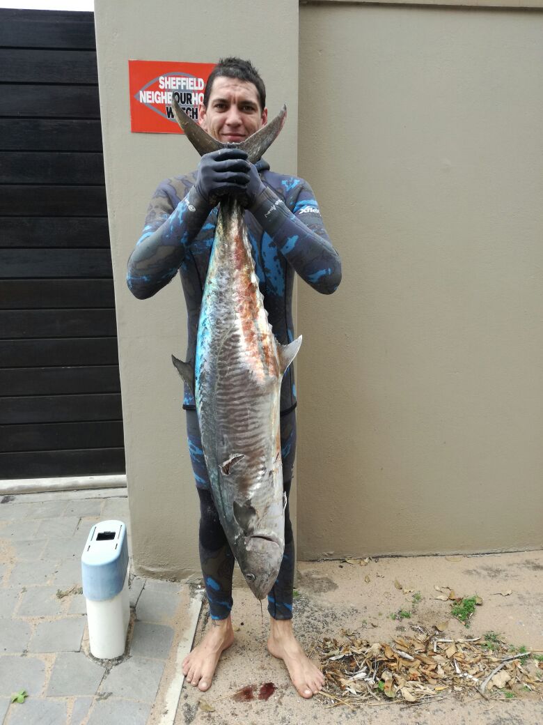 The diving conditions this week have been average. Garrick are around in shoals and big singles. Huge Croc king mackerel are coming out up and down the coast. Unfortunately diving is out this weekend due to a huge frontal weather system which hit today (Friday). Well done to Bryce Buis and Kobus Delport on getting the fish of the week a 17kg king mackerel each! Exceptional seeing as they were both shot on shore dives. As always dive safe and straight spears.