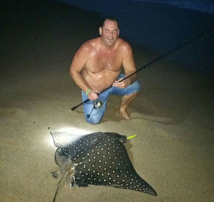 I don’t know what happened but I felt him starting to pull off slowly again, I just asked to God give me the strength to land this fish. As I was talking to myself, I started gaining my line back and it felt like the fish had given up on fighting me. I tried a few times to beach him, but then almost out of the blue this wave, a lot bigger than the normal height, started peeling towards me and it was like a voice calling out to me: this is your break! I quickly lifted the rod kept the line tight and, as the wave came through, I ran backwards reeling in very fast to beach this boykie. As the wave withdrew, I had the ray on the beach, one of the spectators assisted me and ran and grabbed it under the mouth for me and dragged it up the beach. Tired, and my arms sore, I just fell to my backside and sat there looking at what was a Spotted Eagle Ray roughly of about 24 kilos; catching my breath and with the crowd clapping at my achievement of a dog fight between me and this beautiful Spotted Eagle Ray that landed up lasting 1 hour and 25 minutes. My wife eventually got me kneeling besides my ray and took some photos of me and my achievement, I eventually gave my rod to my son to hold as I removed the Rapala Max-Rap from its mouth using a pair of pliers. I then slowly pulled him towards the water by his mouth which is the best way to handle a ray without hurting it so always remember that reader’s.