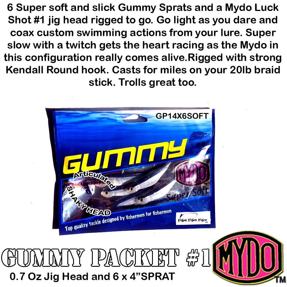 Super soft Gummy Sprat plastics fit to a Mydo Luck Shot #1 jig head for natural flowing results.
