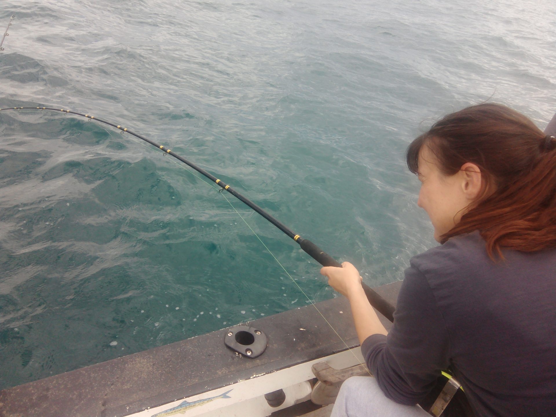 But the bait eluded us and for a while, and we wandered around the usual mackerel hangouts but got only little useless orange fishies and a few cigar shaped maasbankers, or karapauw if you are up north. But then our lady crew on board, Ansie van Biljon (she was meant to bring the luck too), had her rod buckled over as a whole shoal of mackerel jumped onto her hooks. A full and tangled line later the mackerel were swimming lekker in their new home. Our live bait hatch. Ansie went down again and straight away got into it on the way down. She pulled and pulled and next thing three tiny little bonito come flying through the air. Bang! This was our ticket.