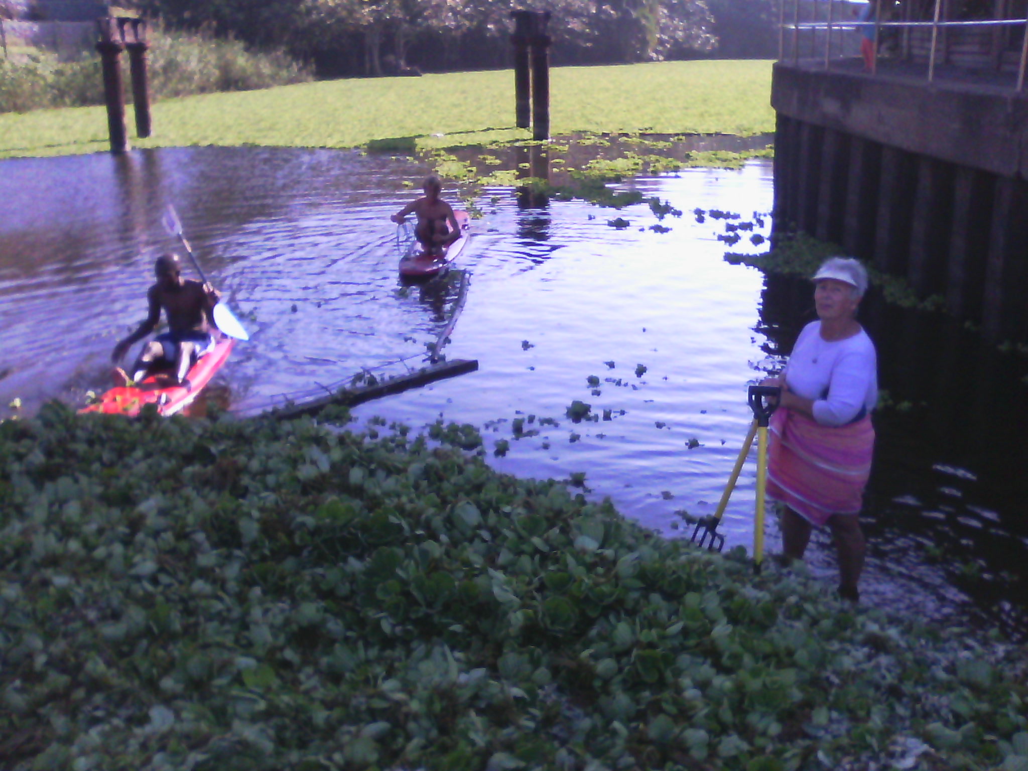 Then along came Environmental Affairs – represented by Ms. Joanne Hope, an entomologist, who got right involved. After visiting Ground Zero, Ms. Hope was witness to the many dead and dying fish, gasping for air – and trying to escape the oxygen starved water. Some were seen still flapping, a few metres away, on the rocks as they tried a last ditch effort for air. The water lettuce invasion was still blazing, but streaks of brown (dying plants) could be seen, from the herbicide. The dead plants were sinking to the bottom, adding to the already challenging ecological problem. Fortunately, the rope trick, deployed by the surfers, strung across the water at the old bridge…kept the water lettuce at bay, in the area on the sea side of the bridge.